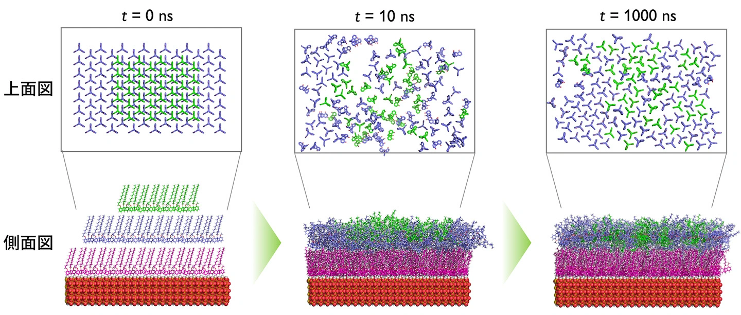 - プロペラ状骨格をもつ三脚型トリプチセン誘導体の自己組織化薄膜について、全原子分子動力学(MD)シミュレーションにより、表面上での分子配向と秩序化の「動的プロセス」を分子レベルで初めて可視化・解明