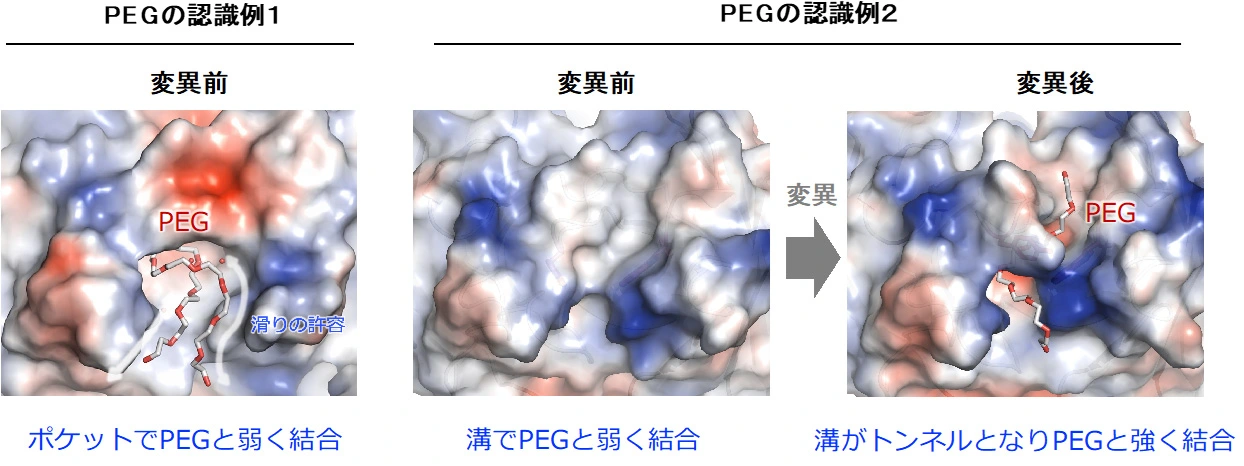 認識例1では、変異前のB細胞受容体が水を介して弱くPEGと結合している。B細胞受容体は10量体程度のPEGを認識しており、その滑りが許容されている。認識例2では、変異前には溝でPEGを認識していると予想され、変異後には溝の上に屋根ができてトンネル構造となり、より強くPEGを捕らえるようになった。このトンネル構造は単純な変異によって生み出さる。PEGは細いポリマーであるため、単純な変異で生み出された狭いトンネルで捕まえることができる。