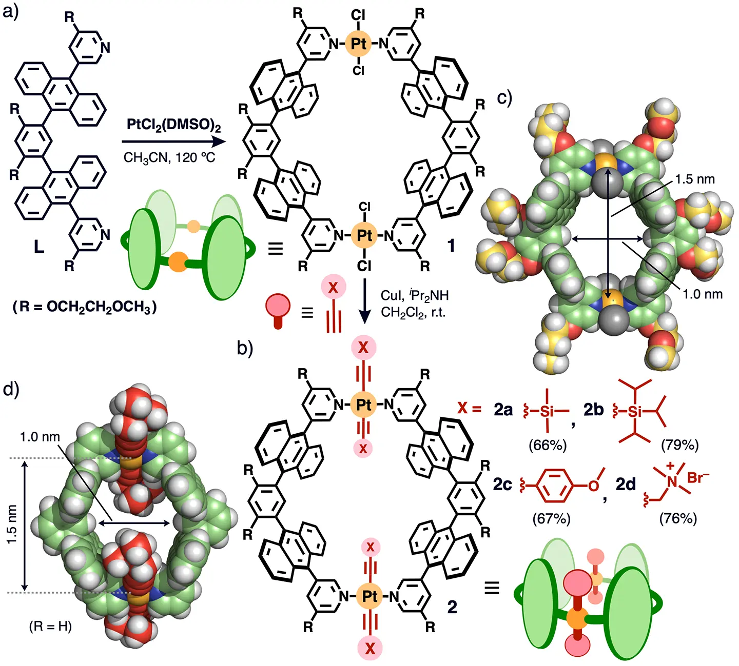 次に、白金上のクロロ基をさまざまな官能基に置換することに成功しました。銅触媒存在下、チューブ1とトリメチルシリルアセチレンを混合することで、1段階目の多点修飾として、4つのアルキニル基が導入されたチューブ2aが得られました(図2b)。また、この修飾法により、立体的にかさ高い官能基(2b)や芳香環(2c)、イオン性の官能基(2d)が導入された芳香環チューブをそれぞれ得ました。イオン性チューブ2dの結晶構造解析では、置換基が傾いているものの、NMR解析から、溶液では1と同様の開いた内部空間を有することが確認できました(図2d)。チューブ2dの性質として、そのイオン性官能基により、メタノールや水などの極性溶媒に対し高い溶解性を示しました。