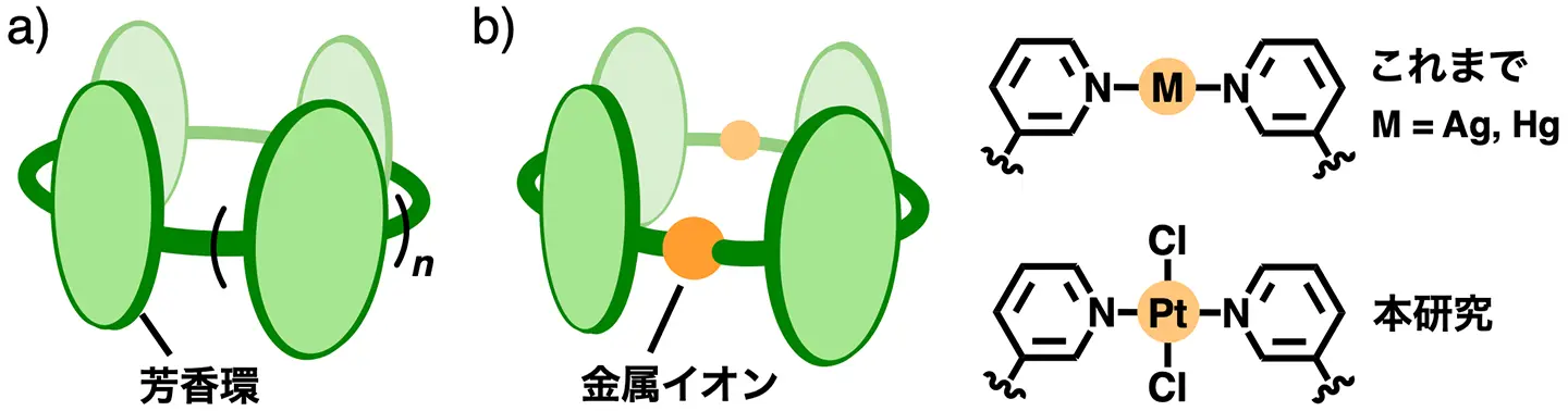 カーボンナノチューブ[用語5]の構造に着想を得て、芳香環のみからなるリングやチューブなどの環状分子が盛んに作製されています(図1a)[参考文献1,2]。これらの筒型空間内部は、分子の捕捉・識別・反応場として注目されています。しかし、通常、多段階かつ長時間の作製操作や条件が必要となることが課題でした。これに対して、金属イオンの配位結合を活用することで、自己集合により環状分子を簡便に作製できます。生成物の性質や機能を向上するためには、その環状骨格を修飾する必要がありますが、配位結合が弱いため、作製後の修飾は困難でした。実際に、これまでに報告された銀や水銀イオンを利用した芳香環チューブは、その構造安定性が低く、骨格修飾はできませんでした(図1b上)[参考文献3,4]。そこで本研究では、環状構造を作製した後の多段階かつ複数箇所での化学修飾が可能となる芳香環チューブの開発を目指しました。その戦略として本研究では、安定な白金-ピリジン結合に着目しました。塩化白金を用いることで高い構造安定性を持つチューブの作製を期待しました(図1b下)。また、白金上のクロロ基は多様な官能基に置換可能であり、さまざまな修飾ができると考えました。