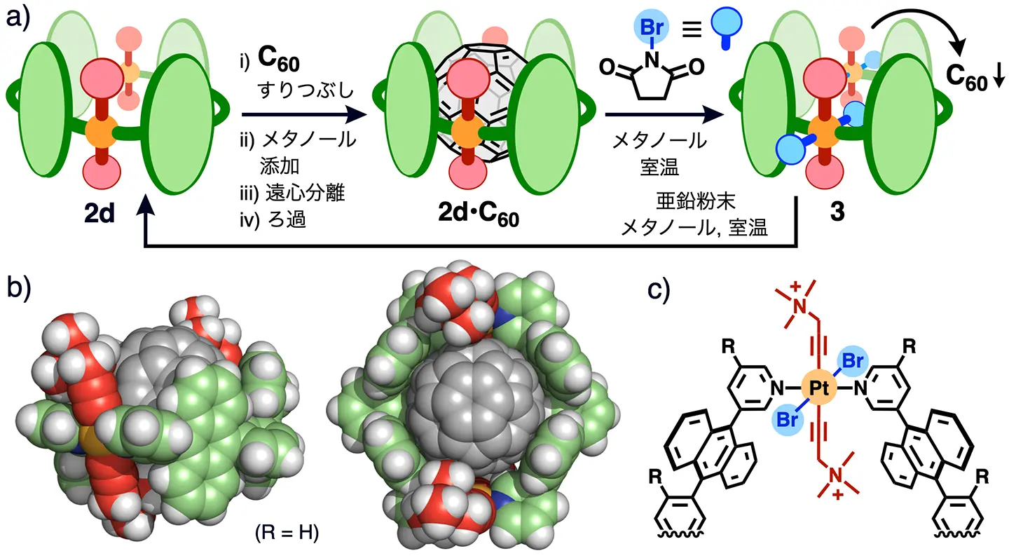 次に、フラーレン捕捉体2d•C60の紫色溶液にN-ブロモスクシンイミド(NBS)を作用させると、溶液が黄色に変化するとともに、C60の茶色沈殿が生じました(図3a右)。この溶液のUV-visとNMR測定から、C60の完全な放出とともに、2dから4つのブロモ基が白金部位に付加した芳香環チューブ3へ変換されたことが明らかとなりました(図3c)。計算構造から、この2段階目の多点修飾で、ブロモ基の立体障害によりC60が放出されたことが分かりました。また、3は亜鉛粉末で還元することにより、修飾前の2dが完全に再生できました。