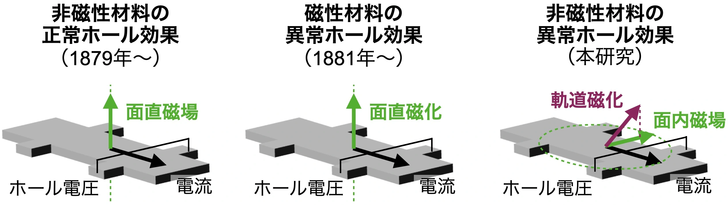 ホール効果は、磁場や磁化に垂直な面内で電子の進む向きが曲げられる現象として、電子物性の理解やデバイス応用の基礎を支えてきました。これまでに、金などの非磁性材料での正常ホール効果[用語2]や、鉄などのスピン磁化[用語3]を持つ磁性材料でのより複雑な異常ホール効果が知られています。さらに最近の理論研究では、非磁性材料においても異常ホール効果が現れる可能性が示唆されていますが、その成分が明確に観測された例はありませんでした。