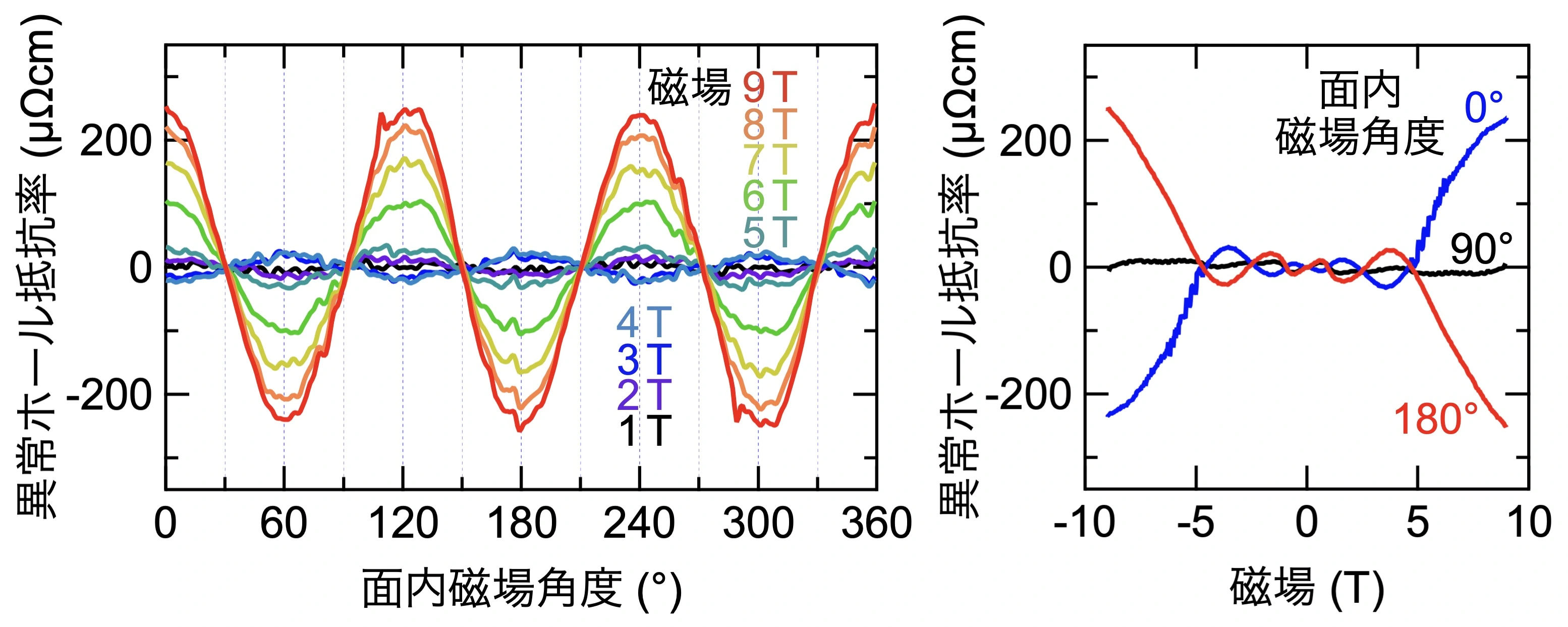 本研究では、分子線エピタキシー法を用いて高品質なCd3As2薄膜を作製し、精密な電気伝導測定を通じて、面内磁場による異常ホール効果の観測に成功しました。この測定では、面内磁場の角度を60度変化させるごとに異常ホール抵抗率の符号が反転し、明瞭な3回回転対称性が現れました(図2左)。また、面内磁場を掃引しながら異常ホール抵抗率を測定したところ、極めて特異で非単調な磁場依存性が確認されました(図2右)。