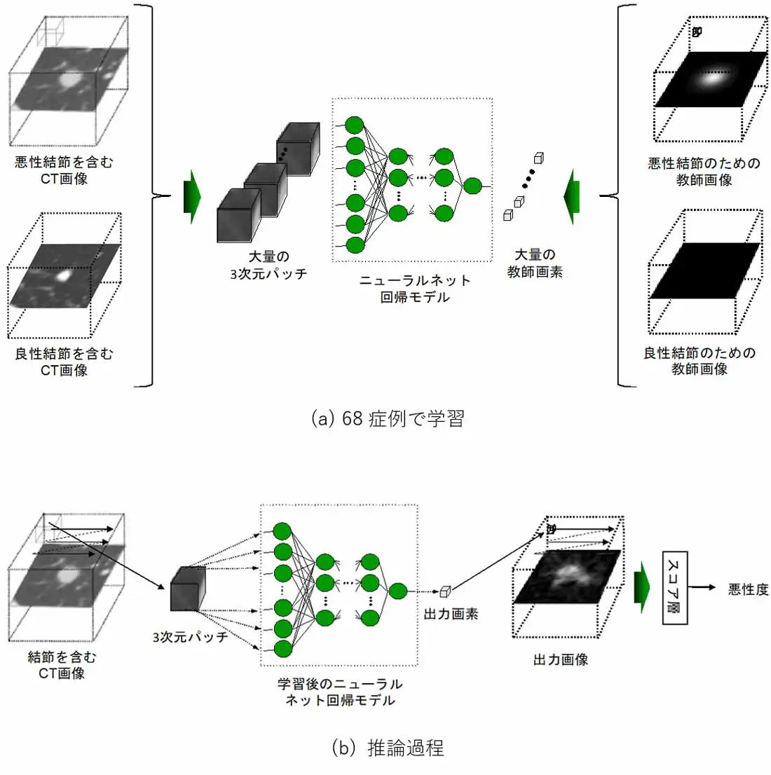 今回の研究では、肺のコンピュータ断層撮影(CT)画像の中から良性と悪性の結節(肺がんの可能性のある病変)の画像を本MTANNモデルに学習させ、結節を見分け肺がん診断支援AIを構築する実験を行いました。通常、医療向けのAI開発には何千症例もの画像データが必要ですが、100症例以下での少数学習を実証するため、米国の多施設で収集されたLIDC-IDRI[用語2]データベースを用い、その中から68症例の肺結節画像をMTANNに学習させた後、616症例の肺結節の画像を用いて良性・悪性の判別テストを行い、判別精度を検討しました。