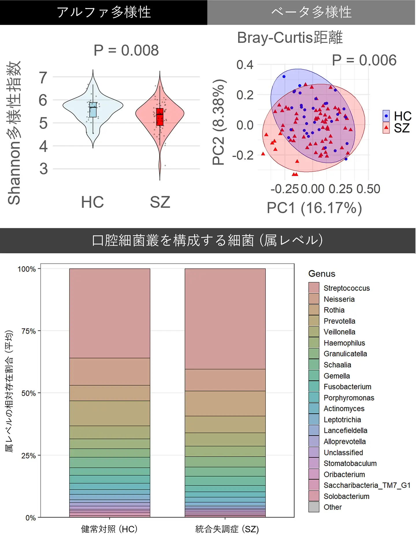 統合失調症(SZ)と健常対照(HC)を比較したところ、口腔細菌叢の構成と多様性に群間差が認められました。具体的には、アルファ多様性(とくに“均等さ”の低下)、複数指標でのベータ多様性の差、および属レベルの差異を確認しました(図1)。