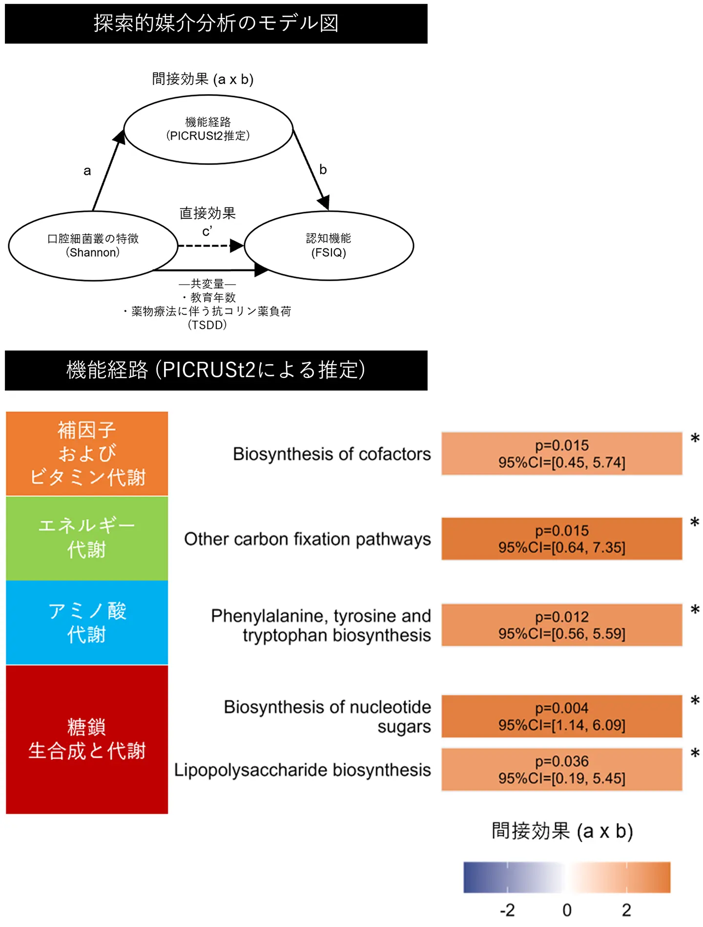 次に、統合失調症における口腔細菌叢の特徴と認知機能との関連の一部に、これらの機能経路が間接的に関与しているかを探索的媒介分析 (*教育年数・薬物療法に関連した累積抗コリン薬負荷 [TSDD]で調整)により検証しました。その結果、補因子/ビタミン代謝、エネルギー代謝、アミノ酸代謝、糖鎖生合成・代謝の4つのグループ(計5経路)で、アルファ多様性と全般的認知機能の関連に対する有意な間接効果が示唆されました(図3)。