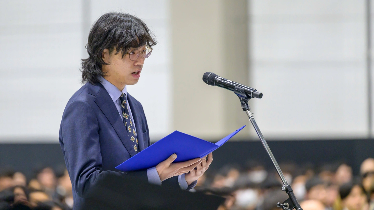続いて来賓や役員、部局長の紹介があり、最後に新入生総代として、学士課程からは医学部医学科の天辰一行さん、大学院課程からは理学院 地球惑星科学系の浅倉裕太さんによる宣誓が行われました。