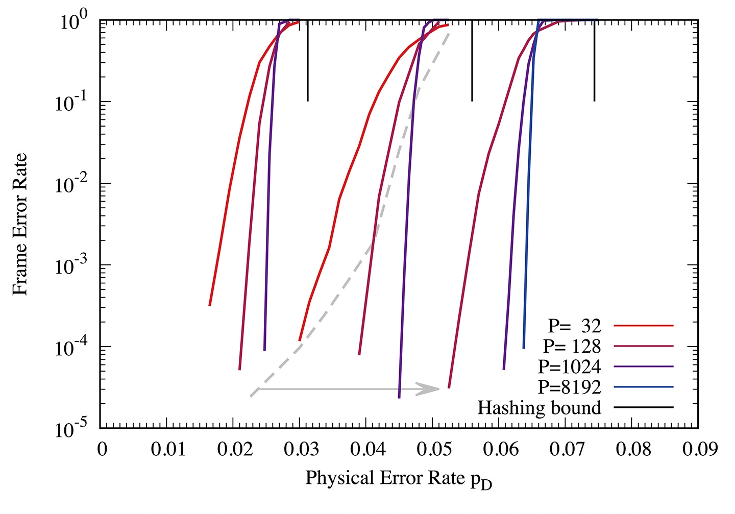 本研究の大きな特徴は、大規模化するほど復号性能が向上するスケーラビリティを備えていること、復号計算量が物理量子ビットの数に比例するだけの効率性を持つこと、そして数十万ビット規模の大きな符号においても極めて高い信頼性を確保できることです。その結果、量子LDPC符号において、従来は不可能とされてきたハッシング限界近傍での高効率誤り訂正を実現しました。本研究は、量子の分野がその水準に近づきつつあることを示すものであり、フォールトトレラント量子コンピュータの実現に向けた大きな一歩となります。