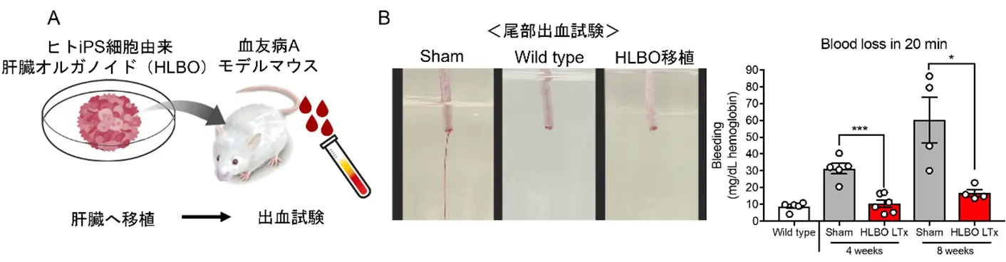 A. 肝臓オルガノイド移植による血友病Aの治療効果を検証した実験の概要図。B. 出血試験の実施状況と、出血量の比較結果。