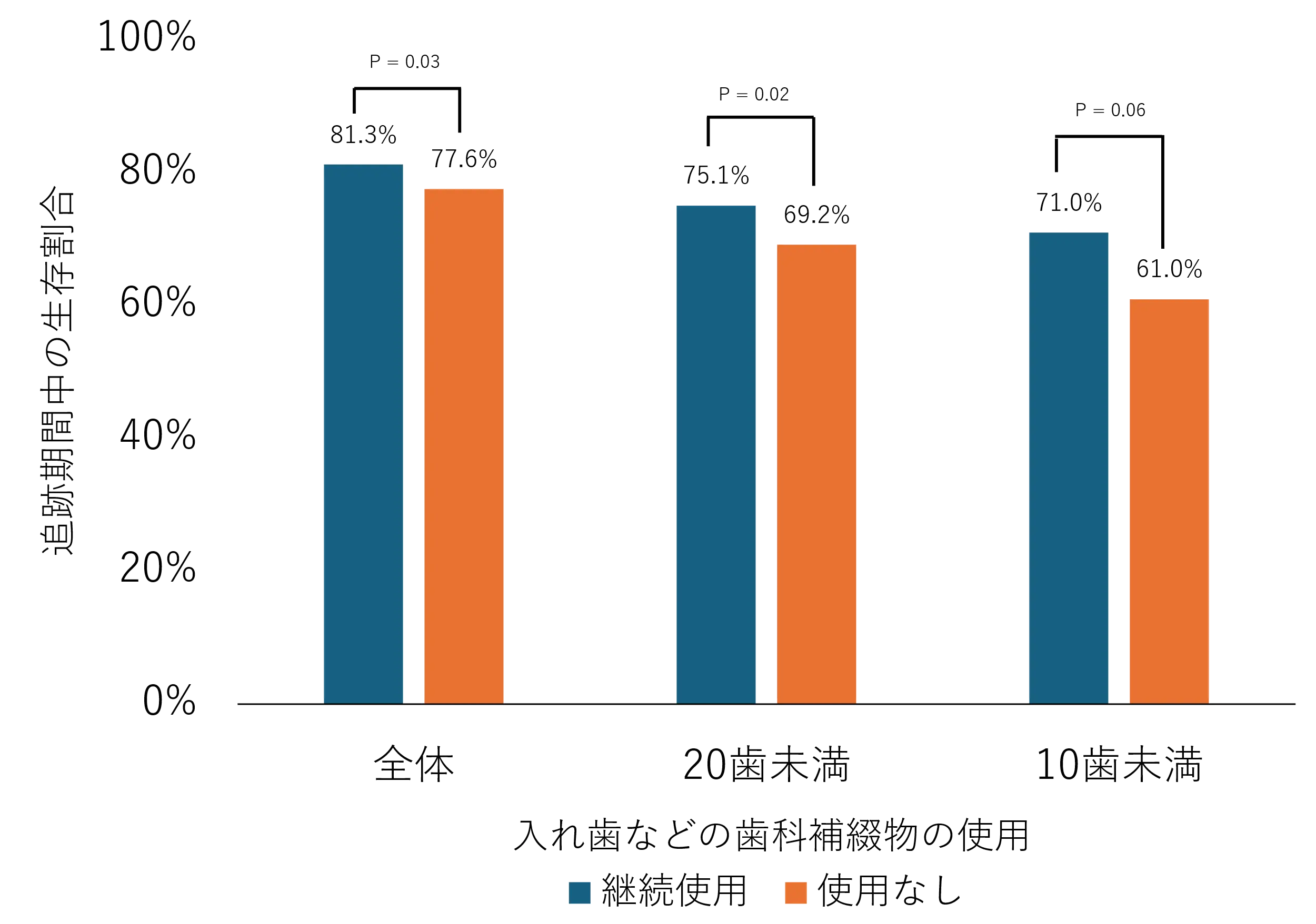 歯科補綴物の使用状況だけでなく、追跡期間中に変化する歯の本数や健康状態などの背景要因も考慮した分析を行った結果、歯科補綴物を継続的に使用していた人は、使用していなかった人よりも生存割合が高いことが分かりました。さらに、自身の歯の本数が少ない人ほど、歯科補綴物の効果がより顕著に見られました。