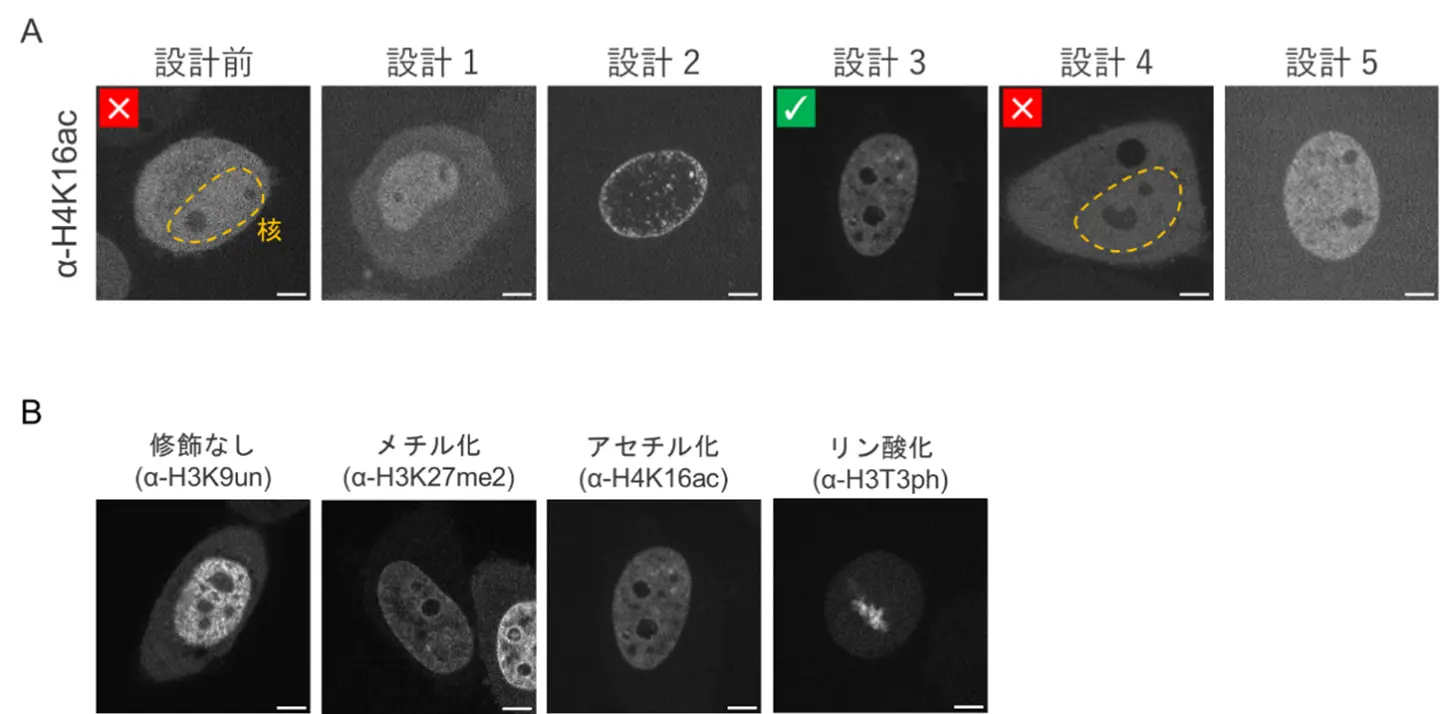 (A) ヒストンH4の16番目のアセチル化リジン残基(H4K16ac)に特異的な抗体を元に作製した細胞内抗体の分布の比較。天然のH4K16ac抗体のアミノ酸配列をそのまま用いた細胞内抗体(設計前)は、標的の存在する核に局在しなかった。一方、本研究の手法を用いて設計した細胞内抗体(設計1〜5)のうち、一部(設計3など)は核に局在した。