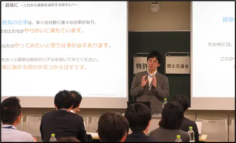 今回の説明会は、学生が中央官庁で働く国家公務員から直接話を聞く貴重な機会となりました。特に、本学を卒業した現役職員の方も参加いただいたことで、学生はとても身近に感じられ、将来の進路に対する視野が広がるきっかけとなりました。