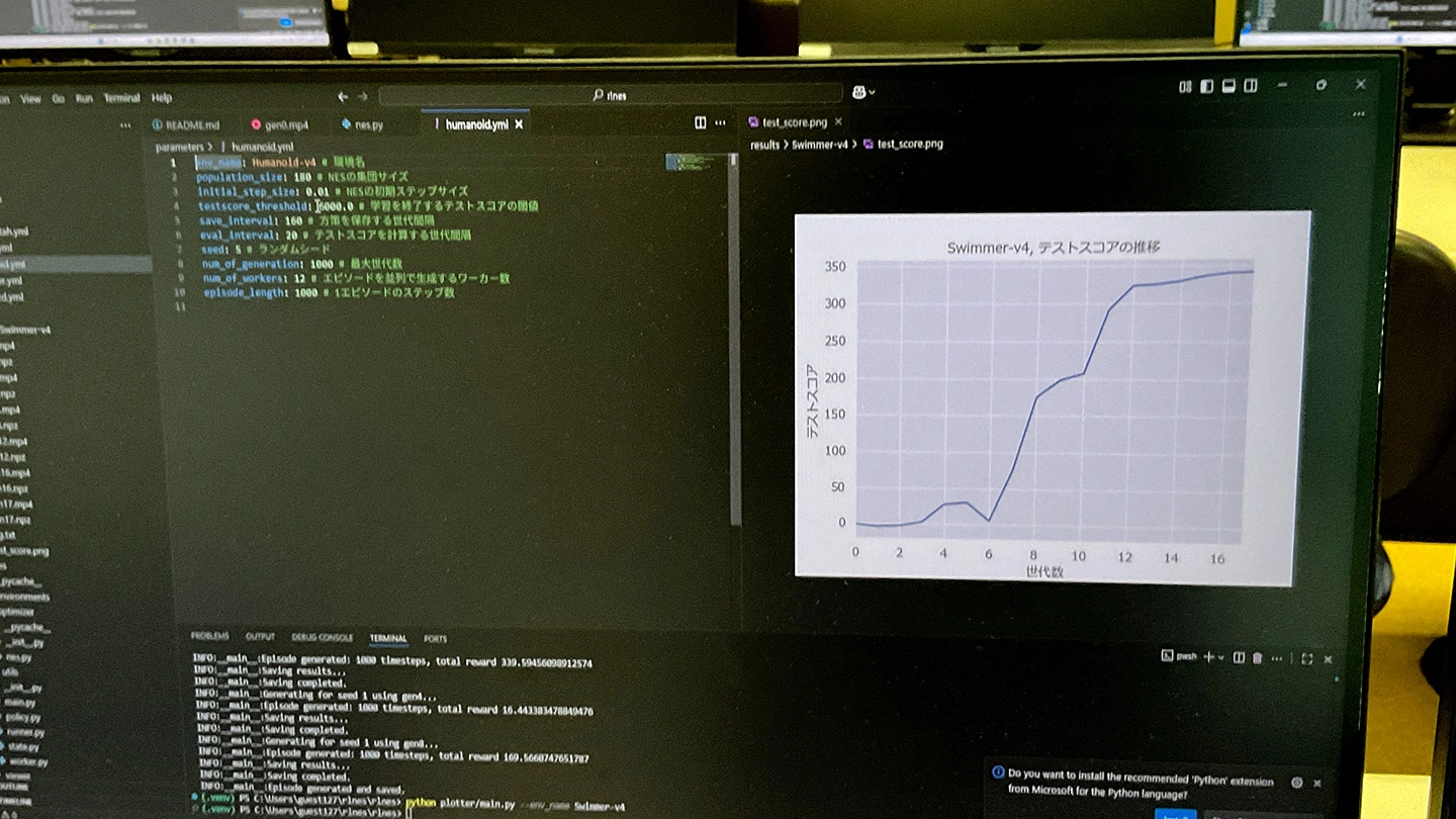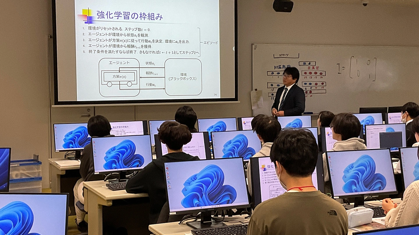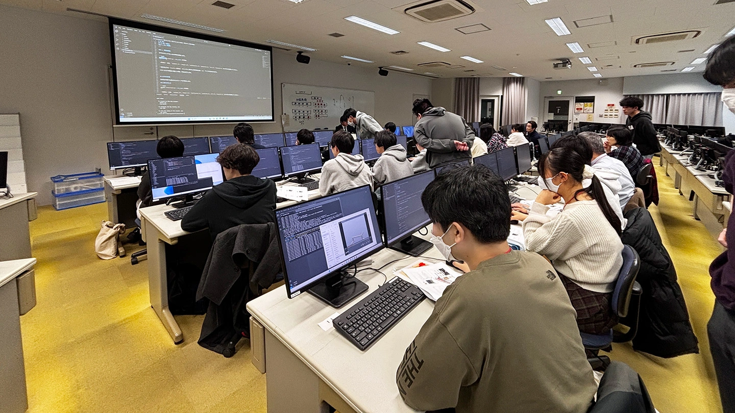 最後の講義では、演習として「Pythonで書かれた進化計算のプログラムにより物理演算エンジン『MuJoCo』を用いた強化学習タスクであるロコモーションタスクを動かす」という作業に取り組みました。参加者全員が2画面のPCを操作し、小野教授が操作するPC画像を見ながら、問題解析を進めました。本学ならではの充実したPC環境のもと、手順の習熟や技術の習得など幅広い学習内容に生き生きと取り組む姿が印象的でした。