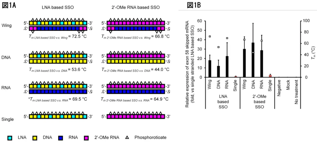 まず、HDSSO技術がLNAベースのSSOおよび2’-OMe RNAベースのSSOに応用可能かを検討しました。ジストロフィン遺伝子を標的とした各SSOに対して、相補鎖としてDNA、RNA、または2'-OMe RNAホスホロチオエート修飾(Wing)を含む3種類を設計し(図1A)、1本鎖SSO(Single)とHDSSOのエクソンスキッピング活性をin vitroで比較しました。