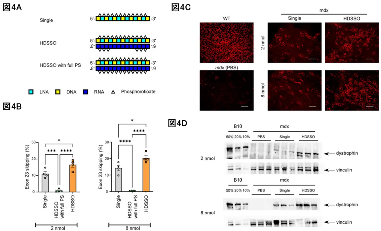 本研究により、HDSSOの活性は相補鎖の種類、長さ、修飾に大きく依存すること、また細胞内での相補鎖の挙動が活性に影響することが明らかとなりました。さらに、in vivoにおいてもHDSSOの優れたエクソンスキッピング効果が確認されました。