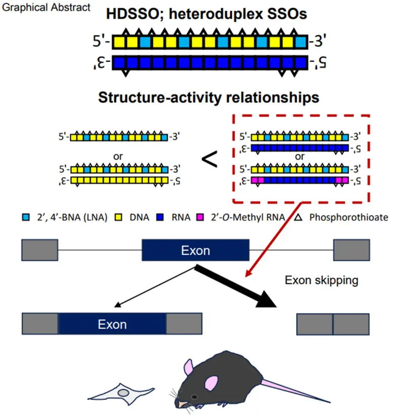 デュシェンヌ型筋ジストロフィーは、依然として有効な治療法が確立されていない遺伝性疾患であり、新たな核酸医薬の開発が期待されています。本研究では、核内送達を効率化するヘテロ2本鎖核酸(HDO)技術をDNAおよびLNAベースのSSOに初めて応用し、優れたエクソンスキッピング活性を示すHDSSO構造を同定しました。また、相補鎖の構造と活性の関係性も明らかにし、細胞内で高い活性を示す設計指針を得ることができました。