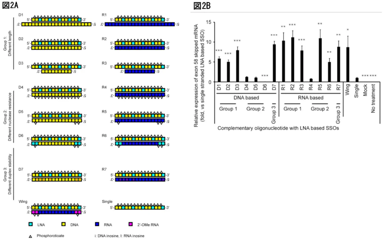 - 本研究では、DNAおよびLNAを基本骨格とするSSOに、核内送達を高める新技術「ヘテロ二本鎖核酸(HDSSO)」を初めて適用しました。