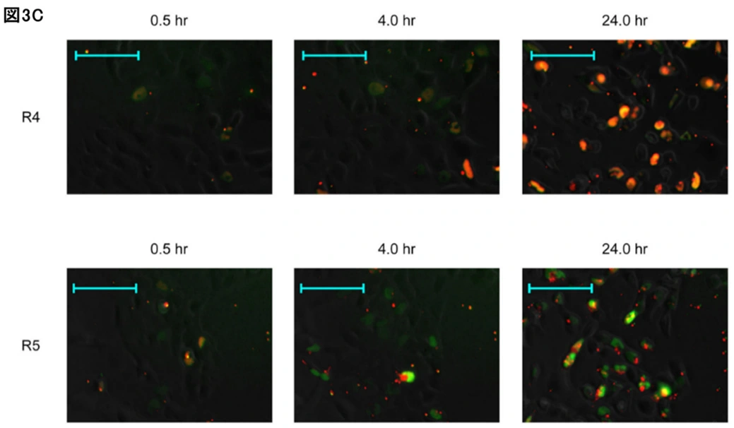 次に、細胞内でのHDSSO挙動を評価するため、グループ2の相補鎖R4〜R6とコントロールとしてwing、R2、Singleを用いて、SSOおよび相補鎖を蛍光標識してタイムラプス観察を行いました(図3A、3B)。導入30分後には全てのHDSSOで核内に両蛍光が確認されました。活性の高いR2やR5を含むHDSSOでは、時間経過とともに赤色蛍光(相補鎖由来)が減少し、相補鎖が核内から消失したと推測されました。一方、R4を含むHDSSOでは赤色蛍光が長時間残存し、相補鎖の排出・分解の遅れが活性低下の一因と考えられました(図3C)。