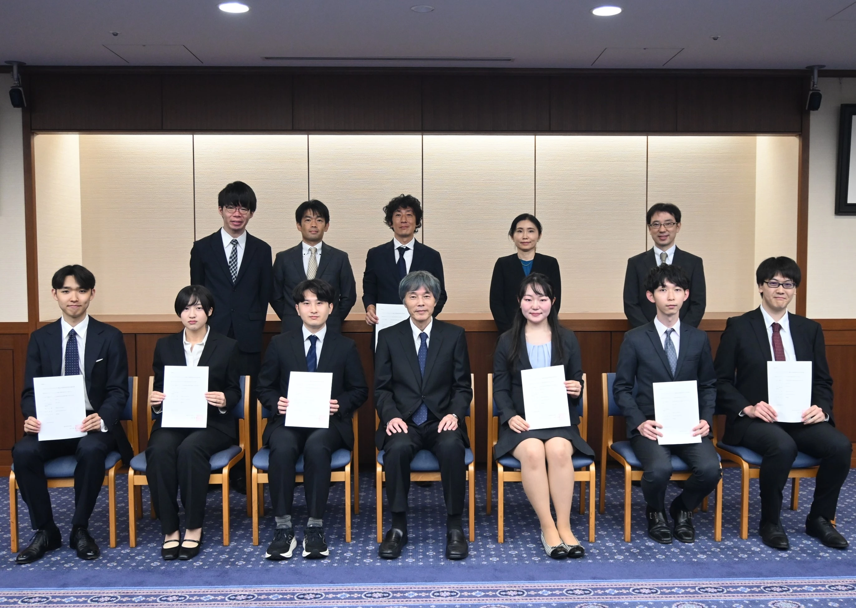 2025年8月8日(金)にМ&Dタワー26階特別会議室にて2025年度クリニシャン・サイエンティスト養成支援制度採用決定通知書交付式が行われ、クリニシャン・サイエンティストとして採用された7名の大学院生へ古川哲史執行役副学長(研究・産学官連携担当)より採用決定通知書が交付されました。