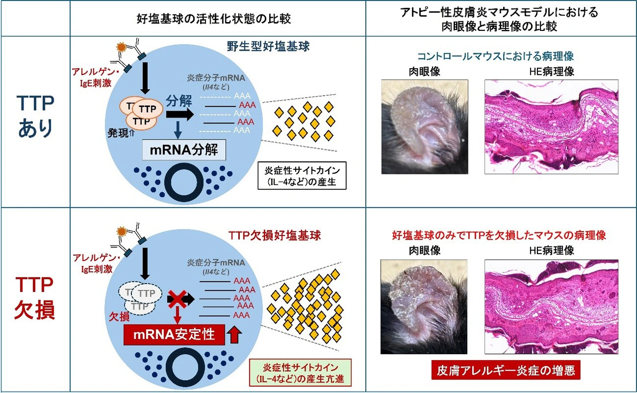 好塩基球が活性化すると、TTPの発現が誘導され、炎症分子のmRNAの転写後の分解を促し、好塩基球の過剰な活性化を防ぐ。このTTPが欠損した場合、TTPによって抑えられていた炎症分子の産生量は増加するため、結果として、好塩基球が関与する皮膚アレルギー炎症は悪化する。