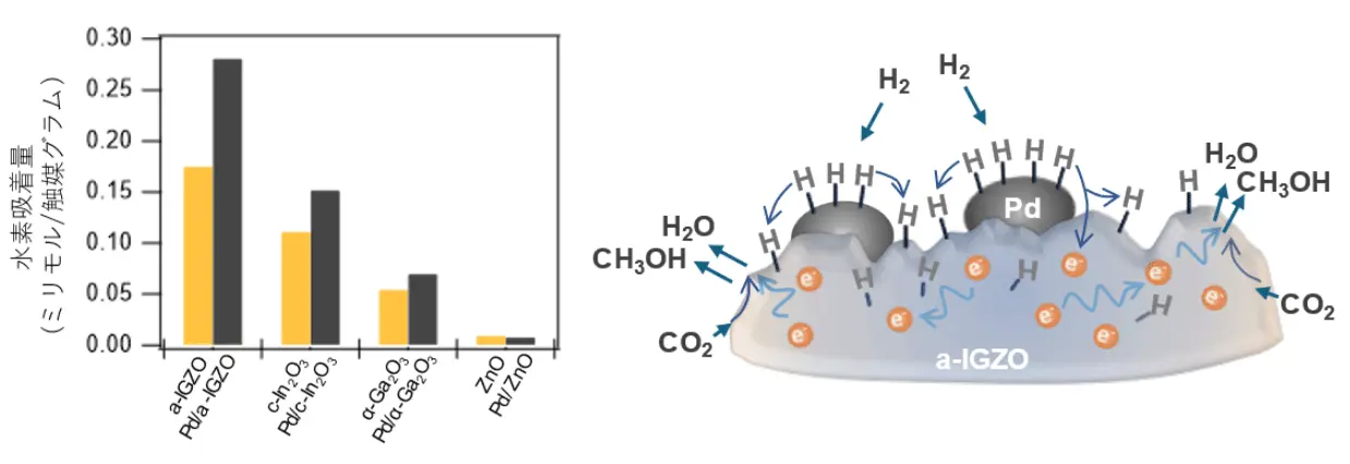 - N型酸化物半導体アモルファスa-InGaZnOx(a-IGZO)がCO2を原料としたメタノール合成触媒になることを見出し、その機構を解明