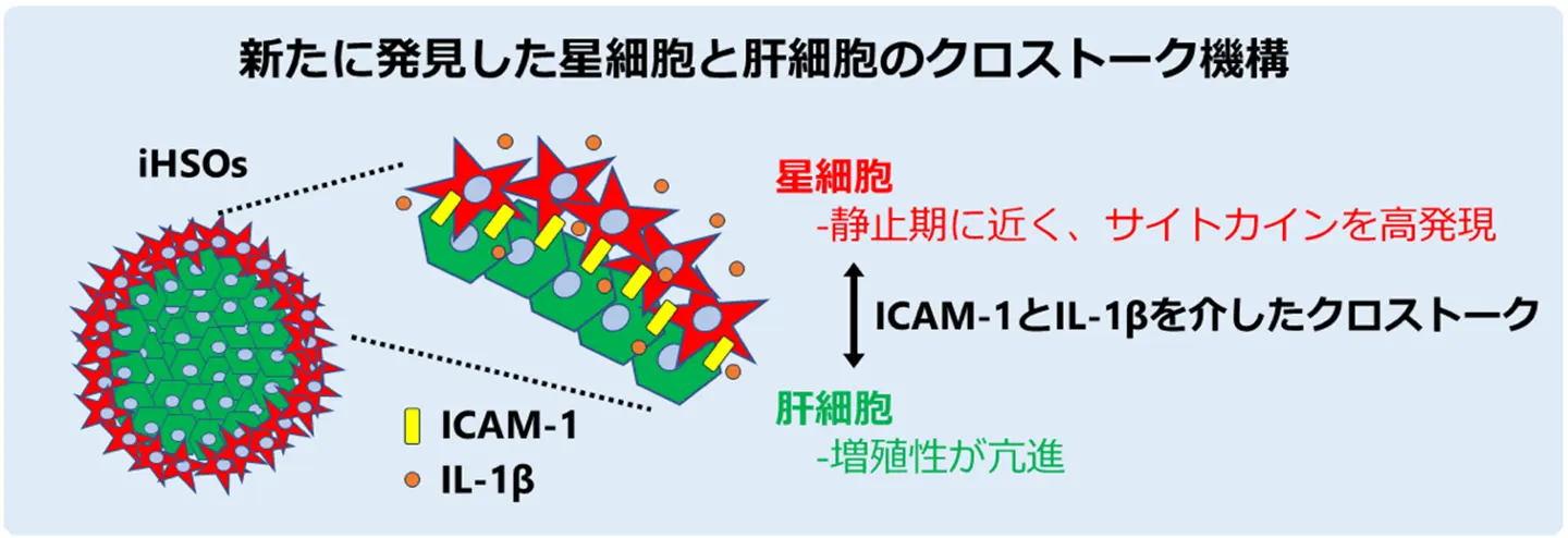 - iHSOは再生肝に似た性質を持ち、肝星細胞膜上のICAM-1を介したクロストークによって、サイトカインを豊富に産生する肝星細胞が肝細胞の増殖を支えることを明らかにしました。