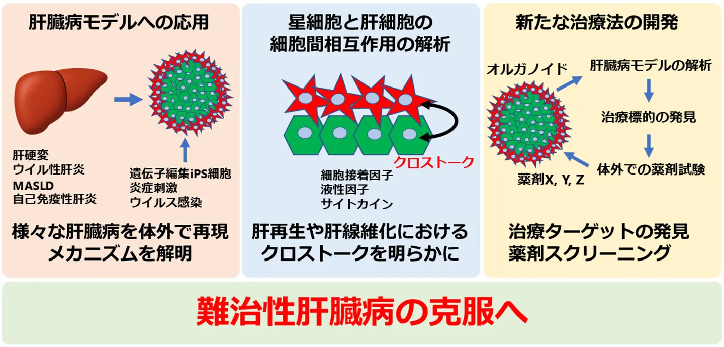 - iHSOは肝障害モデルへの応用が可能であり、肝疾患の病態解明や肝線維化・肝再生を標的とした新規治療法の開発につながることが期待されます。