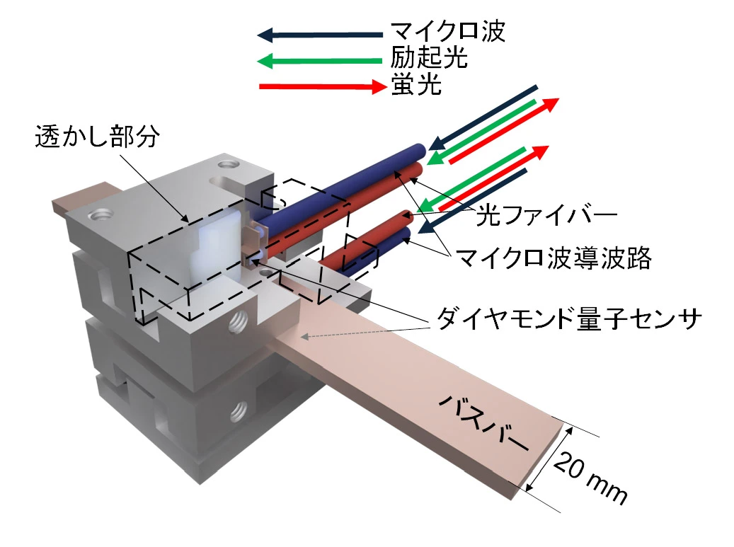 量子センサとしては、合成したダイヤモンド結晶基板を2 mm角に加工して光ファイバー先端に実装し(図2)、CVD成長結晶で重要な結晶方位を調整可能な精密アラインメント機構を備えたセンサホルダを開発しました(図3)。このセンサを、測定対象(バスバー)の上下にペアで配置して差動動作させることで、磁気シールドなしで20 nT/√Hz以上の磁気感度を実現しました。これにより、本研究グループの研究目標の一つであるEV搭載電池モニタに期待される雑音に強く高精度(10 mA)な電流計測を実証しました。