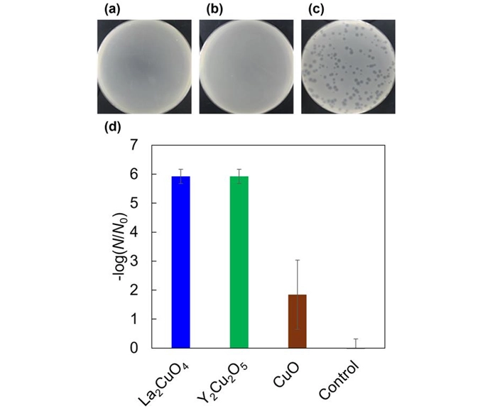ウイルスが不活化されていない状態にあるときは、ウイルスによって宿主菌が破壊された領域である溶菌域(プラーク)が形成されます(図2(c))。一方、La2CuO4とY2Cu2O5に接触させたウイルスは不活化しているため、プラークの形成が見られませんでした(図2(a), 2(b))。図2(d)は、形成されたウイルスプラークの数から算出されたウイルス減少数の対数グラフであり、1目盛り分はウイルス数が1/10になったことを示しています。すなわち、La2CuO4とY2Cu2O5と接触させることでウイルス数が1/100,000以上にまで減少することがわかり、99.999%以上のウイルス減少率が示されました。