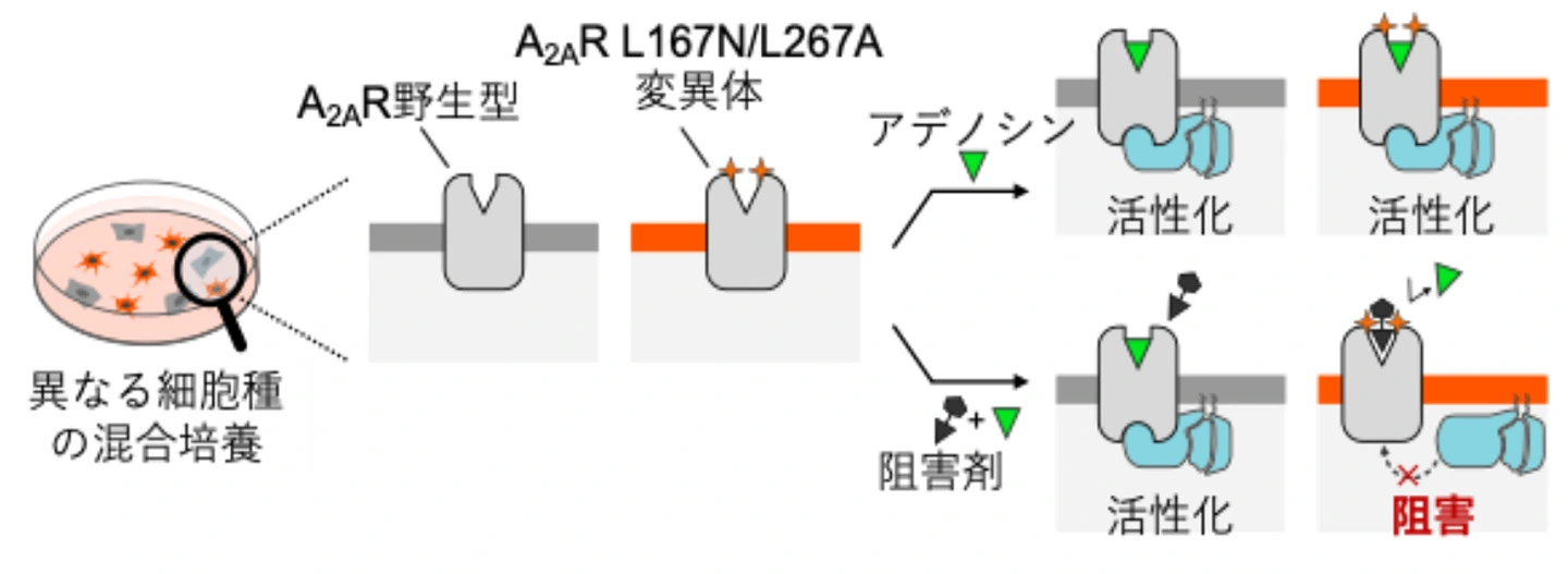 阻害剤感受性を10倍向上させたGタンパク質共役型受容体「アデノシン2A受容体」の新規変異体を同定し、細胞種特異的なシグナル制御を実現