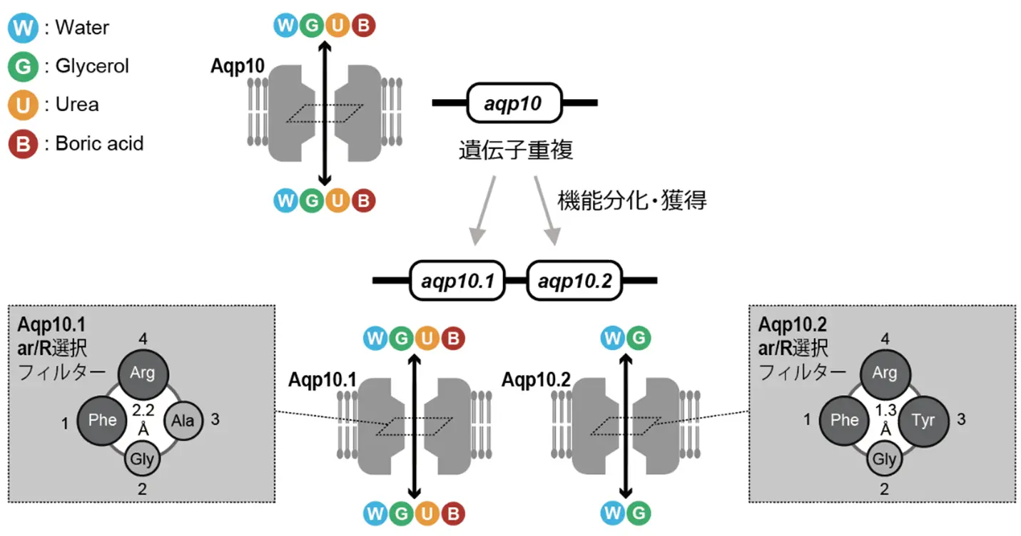 アクアポリン(Aqps)[用語4]は生物に広く分布する水チャネルのファミリーであり、水特異的な透過性を持つAqp(狭義Aqp、classical Aqp)、水に加えてグリセロールなど小さな無電荷溶質を透過するアクアグリセロポリンなどに分類されます[参考文献1]。代表的なアクアグリセロポリンには、ヒトのAqp-3、-7、-9、-10などが含まれます(以下、ここではタンパク質略称は最初の文字を大文字で、遺伝子略称は小文字とイタリック体で表記します)。アクアグリセロポリンのうち、Aqp-7、-9、および-10はグリセロールに加えて尿素やホウ酸も透過します。脊椎動物の過半数を占める条鰭類[用語5]に属する魚類は、ごく一部の例外を除き、二つ以上のAqp10遺伝子(aqp10)のパラログ[用語6]を持ちます。これらのパラログは条鰭類の祖先におけるタンデム重複により生じたaqp10.1とaqp10.2に由来しています[参考文献2]。Aqp10.1は四肢動物[用語7]のAqp10と同様に水、グリセロール、尿素、ホウ酸を透過しますが、Aqp10.2は水とグリセロールを透過する一方、尿素・ホウ酸を透過しない、もしくは弱く透過する性質を持ちます[参考文献3]。また魚類のAqp8は水、尿素、ホウ酸などを透過しますが、グリセロールは透過しません。これらの結果は、Aqpによるグリセロールと尿素・ホウ酸の透過性は異なるメカニズムで制御され、また、尿素とホウ酸の透過性は同じメカニズムで制御されていることを示唆しています。そこで本研究では、Aqp10.1とAqp10.2の溶質透過性の違いを生み出すメカニズムの解明を試みました(図1)。