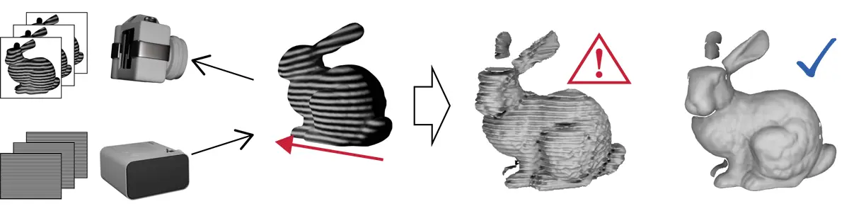 このような3次元計測技術の1つに、プロジェクタとカメラで構成されたシステムを用い、パターンを投影することで3次元形状を取得する「構造化光法」があります。なかでも、少ない投影枚数で静止物体の高精度・高解像度な形状取得が可能な手法として、正弦波パターンを用いる「位相シフト法」が広く利用されています。しかし位相シフト法では複数の正弦波パターンを順に投影・撮像するため、計測中は対象が静止していることが前提となっています。そのため対象が動くと、各パターンを撮像するたびに物体の位置が変わり、プロジェクタとカメラの画素の対応関係がずれてしまうため、従来の形状復元手法では正確な形状を再現できないという問題がありました(図1)。