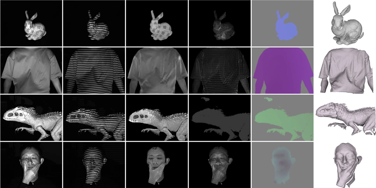 本研究では、ニューラルネットワークの高い表現力を活用したインバースレンダリングの枠組みを活用するとともに、1台のプロジェクタと2台のカメラによる3視点の情報を組み合わせることで、運動物体の複雑な3次元形状を高精度に再構成する手法を提案しました。本手法では、シンプルな正弦波パターンをわずか数枚投影するだけで、高精度な形状再構成を実現しています。