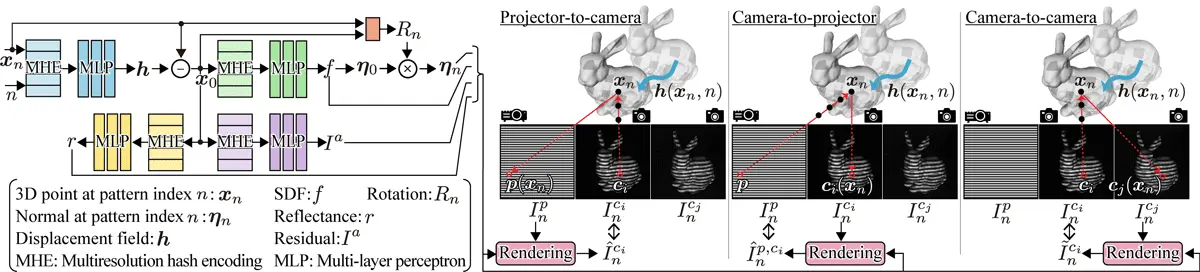 提案したニューラルインバースレンダリングは、物体の3次元形状、動きを表す変位場、物体表面の反射率、残差成分(投影パターン以外の光や投影パターンが2次反射することで生じる)という4つのシーン情報を同時に最適化するように設計されています(図2左)。特に、変位場を用いて、3次元空間上の位置や法線を複数のフレーム間で整合させることで、動きによって発生する形状の誤差を効果的に補正することが可能になっています。