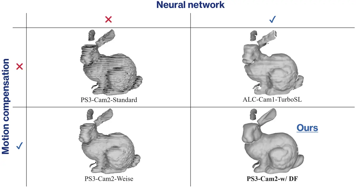 実験では、投影パターンの枚数や、パターンの空間周波数、物体の速度などを変化させながら、提案手法の評価を行いました。その結果、物体が動いている場合でも、わずか3枚の標準的な正弦波パターンで、平均誤差0.23 mm程度の高精度な形状再構成を達成し、静止対象に対する計測と同程度の精度を維持できることを確認しました。また従来の手法と比較しても、動的シーンでの再構成誤差を低減できることを実証しました(図3)。さらに、剛体や非剛体を問わず、さまざまな形状や動きに対して本手法が形状を正確に再構成できることを実証しました(図4)。