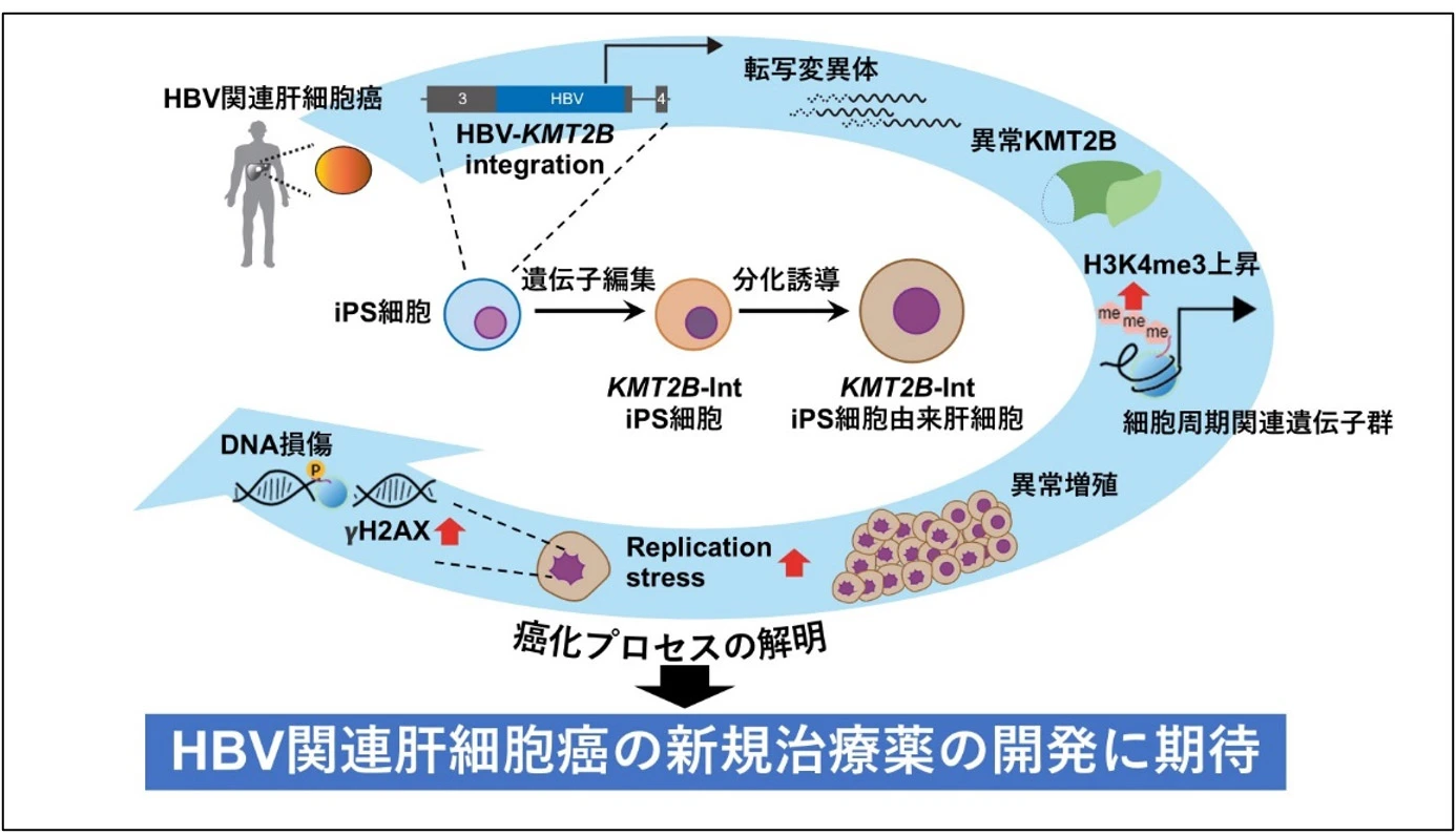 東京科学大学(Science Tokyo)※大学院医歯学総合研究科 疾患生理機能解析学分野の柿沼晴教授、同・肝臓病態制御学講座の朝比奈靖浩教授、同・消化器病態学分野の三好正人助教、土屋淳プロジェクト研究員、岡本隆一教授らの研究チームは、東海大学および順天堂大学との共同研究で、B型肝炎ウイルス(HBV)[用語1]感染後に発生する宿主肝細胞へのウイルスゲノムの組込みが、細胞の増殖性を亢進させ、複製ストレス[用語2]を誘導することで細胞にダメージを与え、肝発癌に寄与することを初めて明らかにしました。HBVは宿主肝細胞のゲノムに組み込まれることが知られており、肝細胞癌の発生に寄与すると考えられていましたが、具体的な発癌メカニズムは不明でした。研究チームはHBV関連肝細胞癌において、HBVの組込みが頻繁に起こるKMT2B遺伝子領域[用語3]に着目し、正常なゲノムを有するヒトiPS細胞モデルにおいて人工的に病態を再現し、HBV-ゲノム組込みによる肝発癌の新しいメカニズムを解明しました。本研究の成果により、HBVを背景とした肝細胞癌に対する新たな治療法の開発が期待されます。