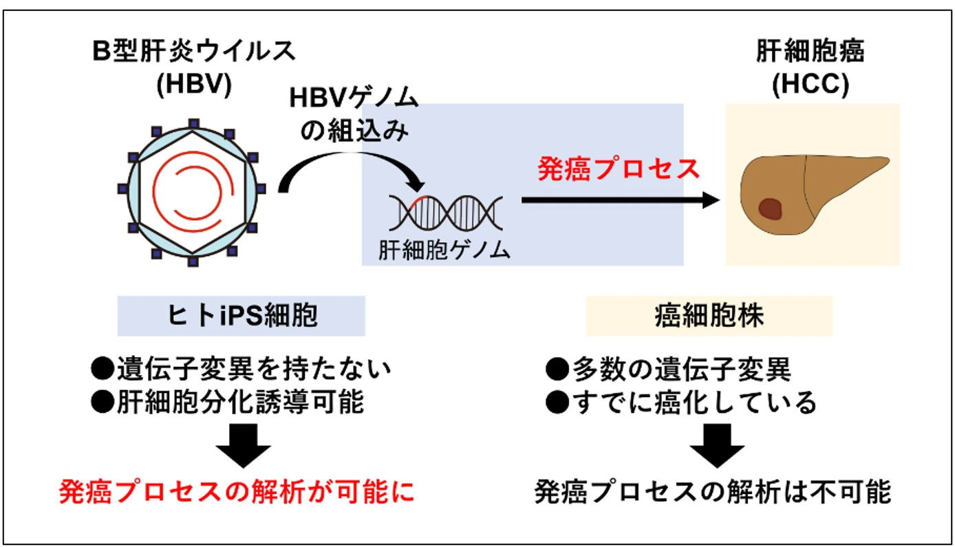 - ヒトiPS細胞を用いたB型肝炎ウイルスゲノムが宿主ゲノムへの組み込まれる現象を再現し、従来の方法では解析が困難だった肝発癌の初期過程を解明