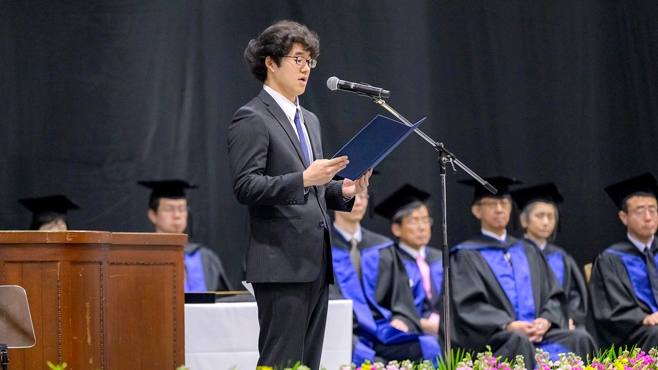 謝辞では、卒業生・修了生を代表して、学士課程は情報理工学院数理・計算科学系のLiu Mingdaさん、大学院課程は物質理工学院材料系材料コースの彦坂元さんが、これまでの研鑽の日々と周囲への感謝の言葉を述べました。
