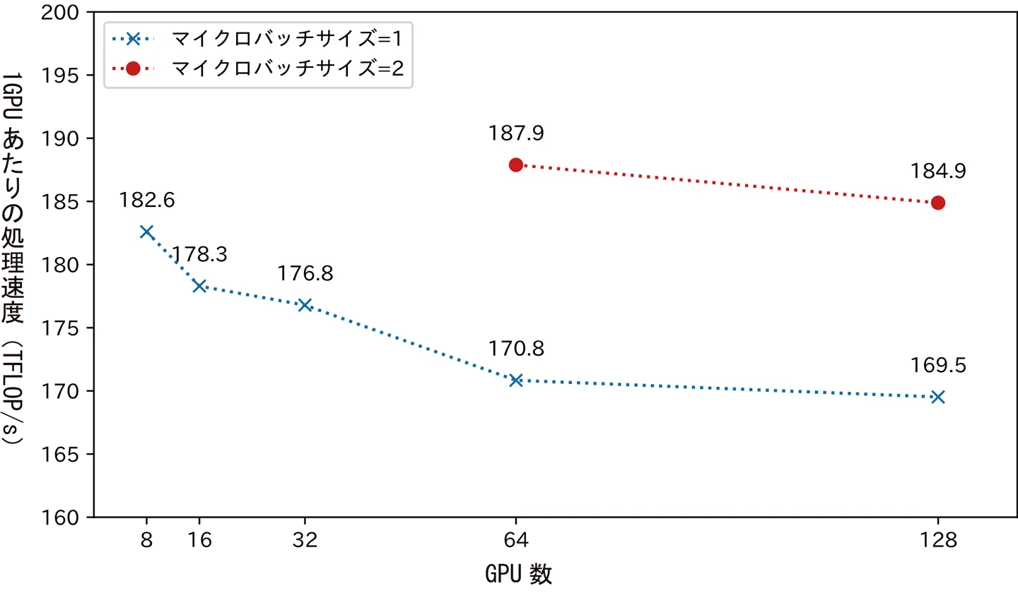 サイズ=2の設定では、128GPU(16ノード)で大規模言語モデルを学習する際でも、8GPU(1ノード)で学習する場合と同等以上の計算効率(184.9 TFLOP/s)を達成できることを確認しました。