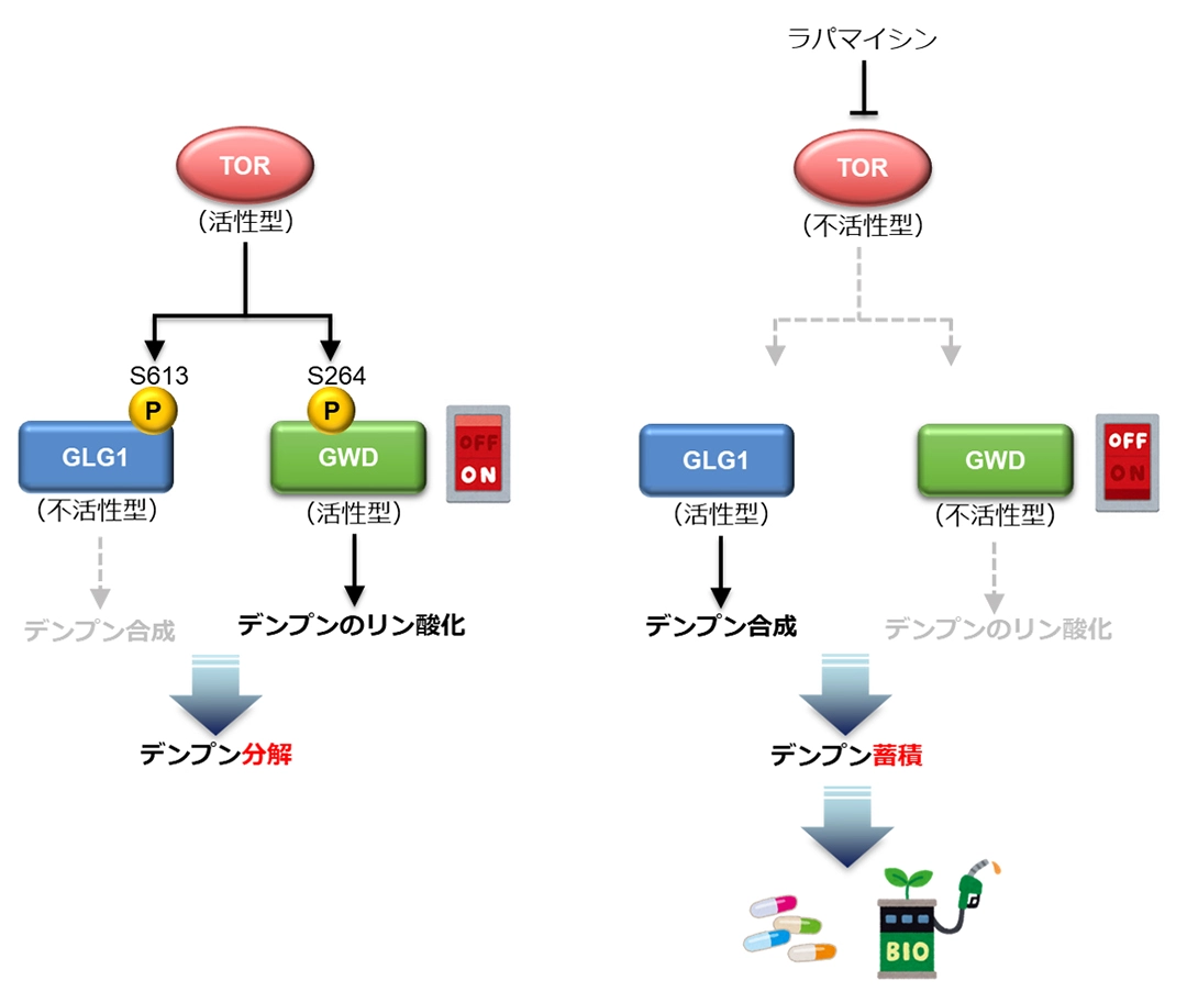 しかし、藻類がデンプン量を調節する仕組みはこれまでほとんど分かっておらず、藻類を用いたデンプン生産の生産性向上にはその仕組みの解明が必要とされていました。そのうち、デンプン合成が調節される仕組みは、研究グループによる以前の研究で明らかになっていました[参考文献2]。この仕組みでは、GLG1タンパク質[用語3]の特定のアミノ酸がTOR[用語4]シグナル伝達経路によってリン酸化されることで、デンプン合成量が調節されます(図1)。しかし、デンプン分解が調節される仕組みについては、TORシグナル伝達経路がデンプン分解にも関与しているかどうか、またその分子機構はどのようなものかなど、不明な点が多く残されていました。