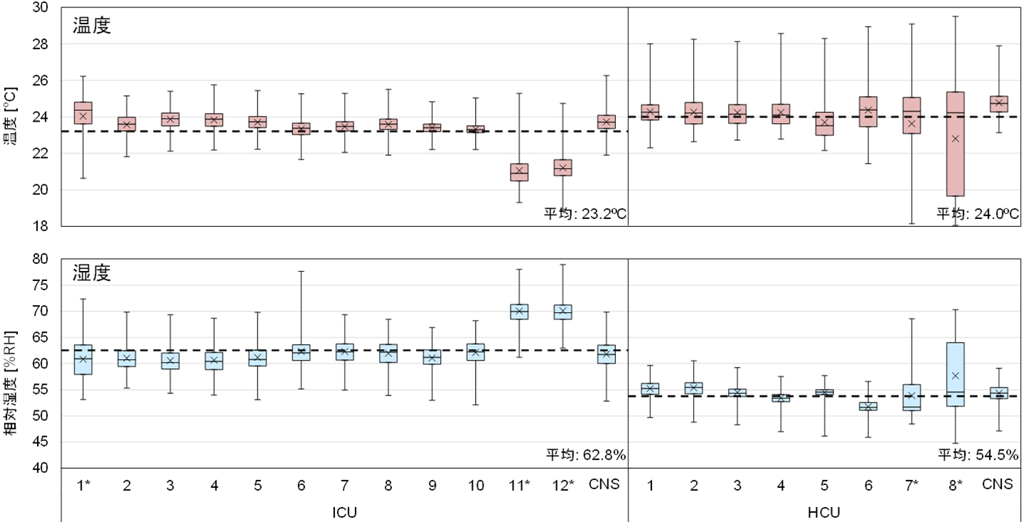 本研究では、オープンフロア[用語4]を基本とした大学病院のICUとハイケアユニット(HCU)[用語5]を対象とし、2023年7~9月に包括的な環境測定(温湿度・空気質・照度・騒音)と医療従事者へのアンケートを実施しました。