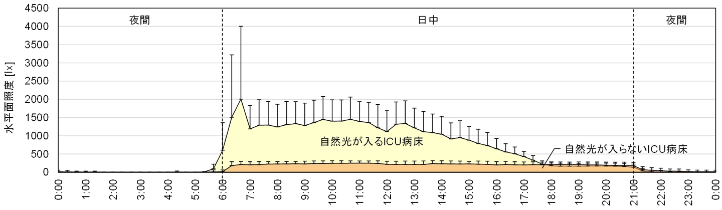 照度については、ICU内でも自然光が入る病床と入らない病床の差が顕著で、自然光が入る病床の754 lxに対し、自然光が入らない病床は218 lxでした。ICU病床の水平面照度を時刻別に見ると、自然光が入らない病床では1日を通して低い値で安定しているのに対して、自然光が入る病床は日内の変動と日ごとの変動(エラーバー)がともに大きい状況でした(図3)。