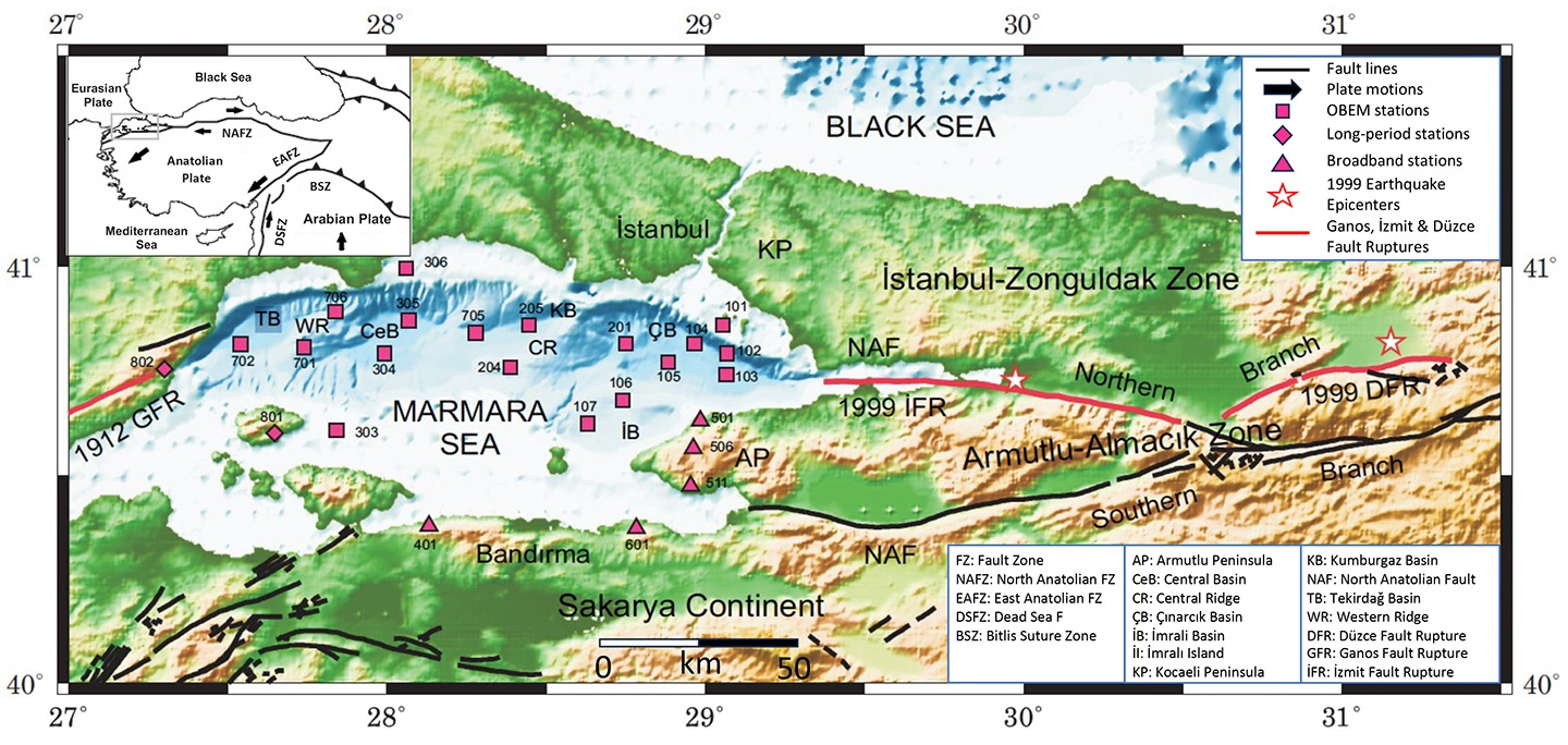北アナトリア断層は、トルコ国を東西に横断する全長約1,500 kmの右横ずれ断層で、1939年のエルジンジャン地震以後、震源を東から西に移しつつマグニチュード7クラスの巨大地震の発生源となってきました。最後の地震はコジャエリ(イズミット)地震(マグニチュード7.6)であり、1999年に発生しました。次に発生する地震は、このコジャエリ地震のさらに西側のマルマラ海付近で発生すると予想されていますが、断層が海底下であるために、断層構造に関する研究が困難でした。