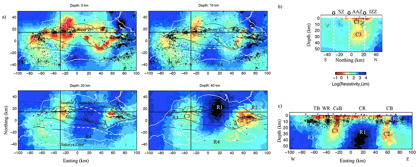 本研究では、図1のように、マルマラ海海底およびその周辺の陸上において電磁気観測を実施し、断層周辺の3次元比抵抗構造を解明することに成功しました。図2(a)は深度5 km、10 km、20 km、40 kmにおける比抵抗分布を示しています。また、図2(b, c)は、中央部の東西断面と南北断面を示しています。比抵抗は地殻中の流体の分布を反映するので、“比抵抗が低い部分は流体に富み力学的に弱い変形域”、“比抵抗が高い部分は流体に乏しい固着域”と推定されました。これによって、巨大地震を発生しうる固着域の位置を推定することが可能となりました。