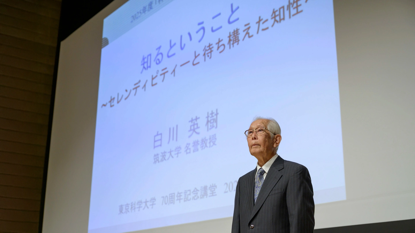 東京科学大学(Science Tokyo)では、2016年度から実施している学士課程1年生向けの授業「科学・技術の最前線」の特別講義の動画を10月10日に公式YouTubeチャンネルで公開しました。特別講義は、6月4日、大岡山キャンパスの70周年記念講堂にて、本学卒業生であり、筑波大学名誉教授で2000年にノーベル化学賞を受賞された白川英樹先生による「知るということ~セレンディピティーと待ち構えた知性~」と題して開催されました。当日は約450人の学生が参加し、会場は熱気に包まれました。