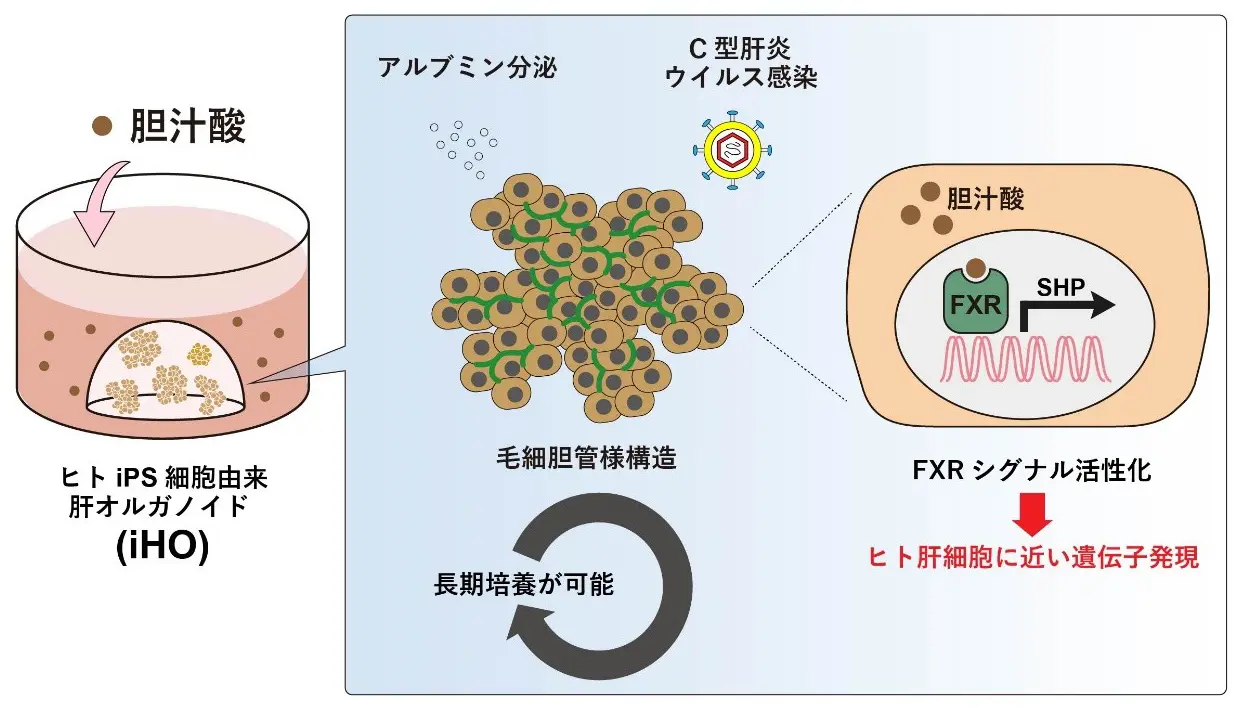 - 開発したiHOは、肝細胞の性質を維持した細胞のみで構成され、3ヵ月間以上の長期間培養が可能であり、その維持には胆汁酸シグナルが重要であることを明らかにしました。