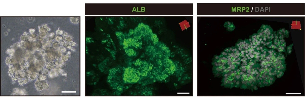 iHOは、生体の胎児肝細胞に近い性質をもつ肝細胞(すなわち胆管細胞の性質が少ない細胞)のみで構成されており(図2中央)、内部には毛細胆管構造など、ヒト肝臓に実際に存在する構造も再現されていることが分かりました(図2右)。