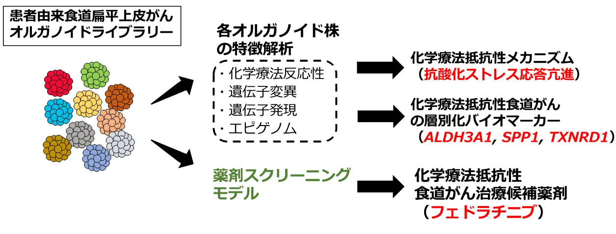これらの課題を克服するため、本研究では、多症例のESCC患者から、患者ごとのESCCの性状の違いを再現可能な「ESCCオルガノイドライブラリー」を樹立しました。このライブラリーには、化学療法感受性のものが17症例、抵抗性のものが7症例含まれています。詳細な解析の結果、前述の通り化学療法抵抗性機構の一端が解明され、化学療法抵抗性ESCCの診断に有用なバイオマーカー[用語5]や、有望な治療薬候補の発見につながりました。