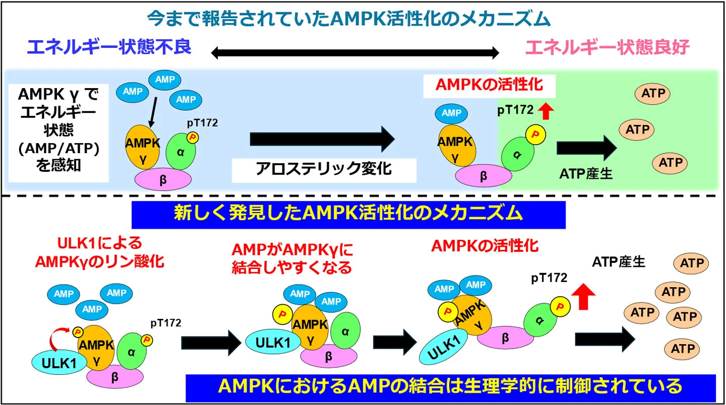 AMPKはαサブユニット(触媒サブユニット)、βサブユニット、γサブユニットからなるヘテロ三量体として存在します。今回私たちは、AMPと直接結合する事でエネルギー状態を感知するAMPKγサブユニットがULK1によってリン酸化される事に着目し、ULK1によるAMPKγサブユニットのリン酸化がAMP結合力を上昇させること、すなわちAMPKのAMP感受性に関わる事を証明しました。これはエネルギー代謝のマスタースイッチAMPKのAMPセンサー部位の感受性が生理的に制御されているという初めての発見です(図1)。