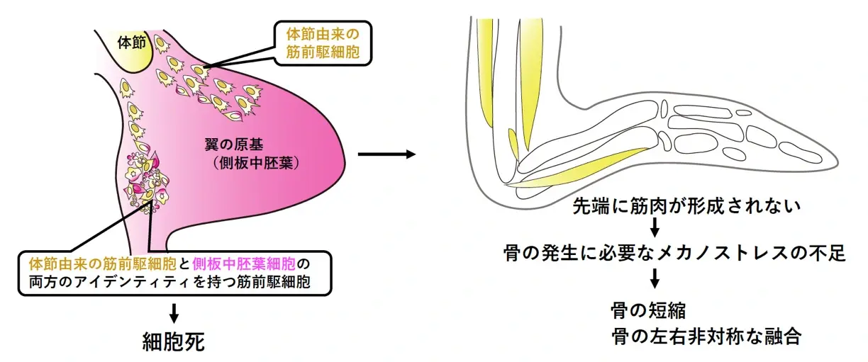 これらのことから、エミューでは、原基に存在する特殊な筋前駆細胞が細胞死を起こすことで翼の筋形成不全が生じ、それによって胚発生中に翼の骨へのメカノストレスが不足するために、骨格パターンに影響が生じていたことが示された。